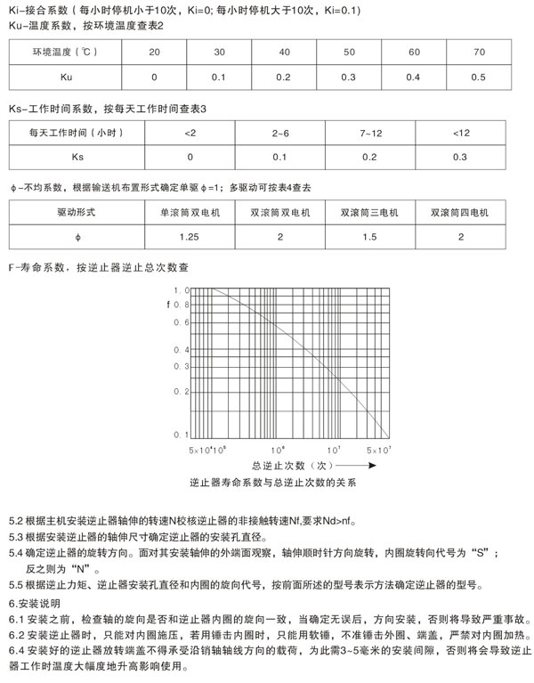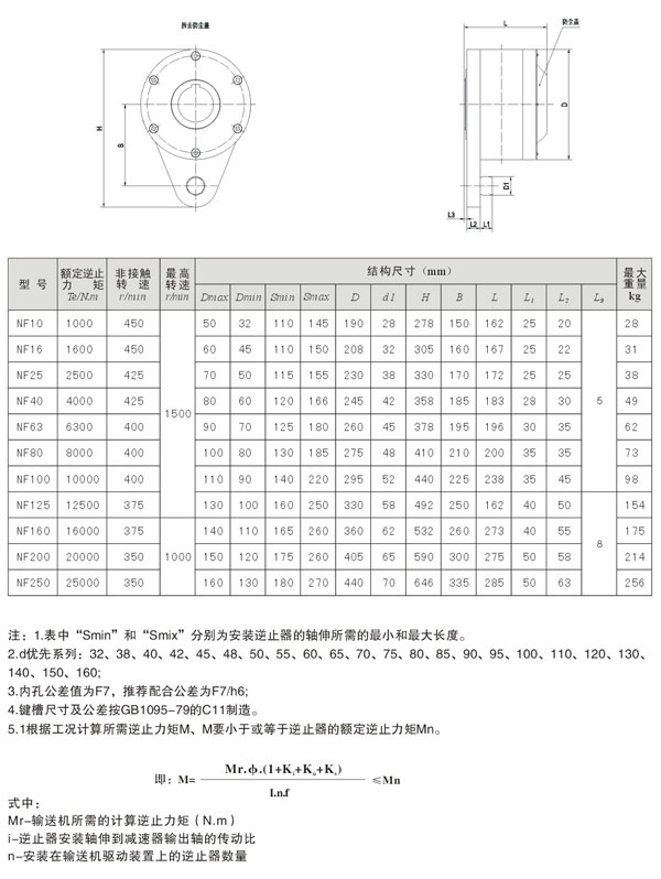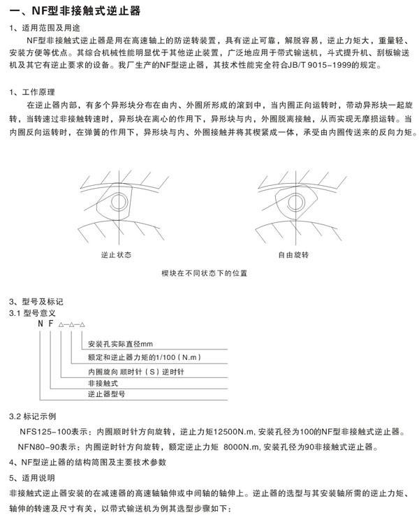 NF型非接觸式逆止器是用在高速軸上的防逆轉裝置,具有逆止可靠,解脫容易,逆止力矩大,重量輕、安裝方便等優點。其綜合機械性能明顯優于其他逆止裝置,廣泛地應用于帶式輸送機,斗式提升機、刮板輸送機及其它有逆止要求的設備。我廠生產的NF型逆止器,其技術性能完全符合JB/T 9015-1999的規定。在逆止器內部,有多個異形塊分布在由內、外圈所形成的滾到中,當內圈正向運轉時,帶動異形塊一.起旋轉,當轉速過非接觸轉速時,異形塊在離心的作用下,異形塊與內,外圈脫離接觸,從而實現無摩損運轉。當內圈反向運轉時,在彈簧的作用下,異形塊與內、外圈接觸并將其楔緊成一體,承受由內圈傳送來的反向力矩。